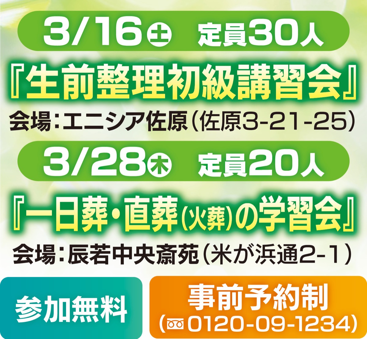 地域密着の辰若葬儀社では、生前整理について学べる無料の学習会を3月16日(土)に実施する。