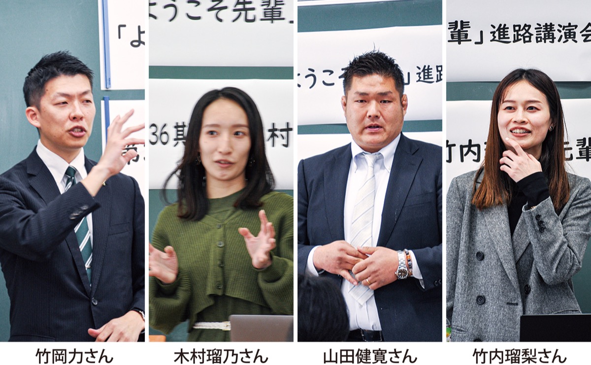 春から新たな一歩を踏み出す生徒らに「生き方のみちしるべ」を示そうと同校のPTAが企画。竹内瑠梨さん(神奈川新聞社/記者)、山田健寛さん(山田興業/解体工事)、木村瑠乃さん(ウインテック/留学カウンセラー)、竹岡力さん(横須賀市市議会議員)の4人が教壇に立ち、学生時代の思い出や現在就いている仕事の失敗・成功などをつまびらかに話した。