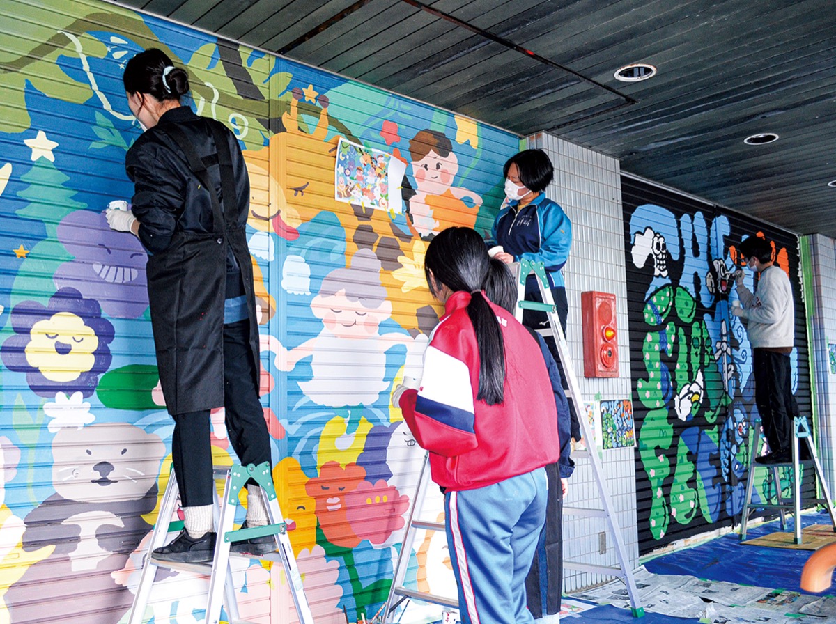 施設向かって左手シャッターの原画を担当した妹尾もえみさん(2年)はデザインの中で様々な世代の人が手を取る様子を表現。学校や住宅街のある同地区に溶け込むイラストを描いた。右側を担当した佐藤晴矢さん(2年)は、風車やカモメ、海軍帽など三浦半島を想起するイメージをデザインに散りばめた。妹尾さんは「普段は一人で画板に向き合うことが多いので、自分の体より大きな対象に皆で作業する経験は貴重だった」と制作を振り返った。