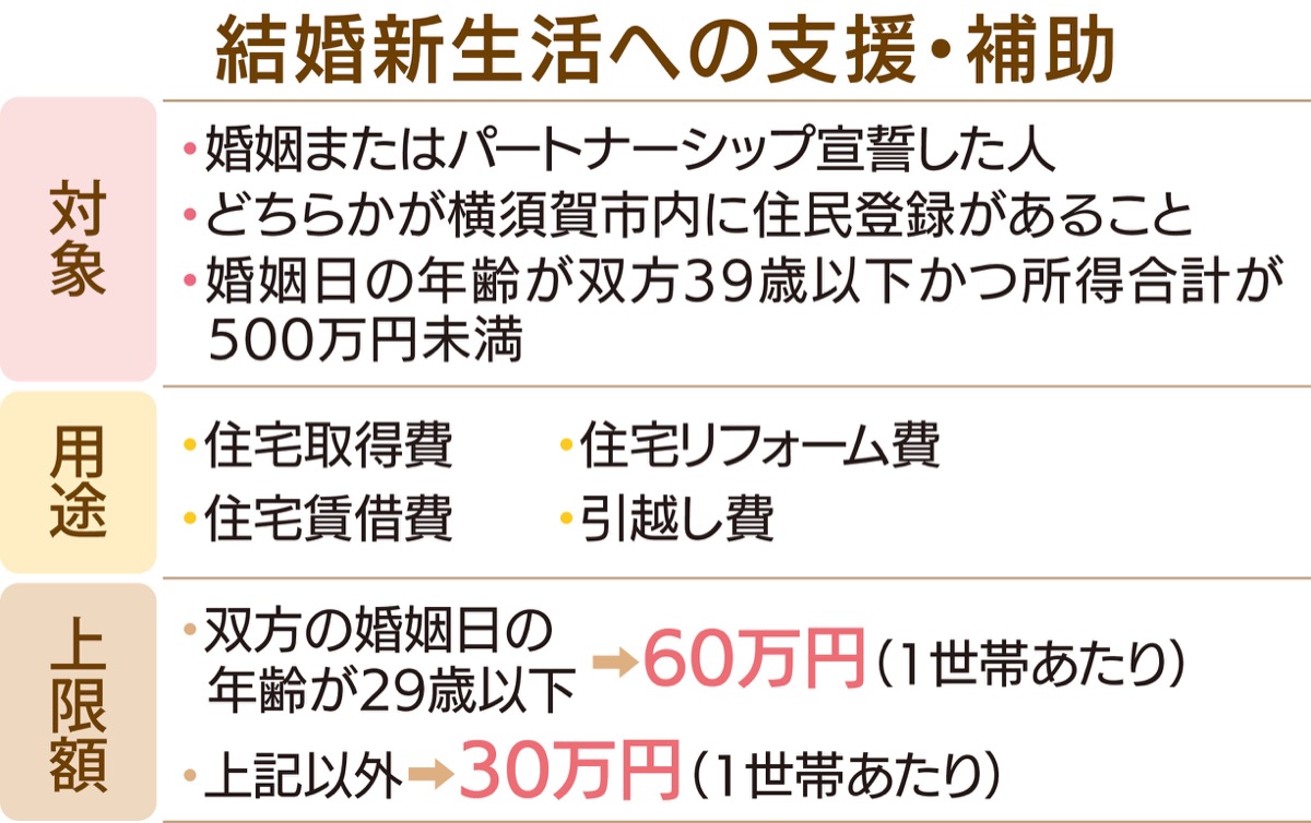 横須賀市は4月から定住促進と少子化対策の一環として、新婚世帯へ新居の家賃や引越し費用等の一部補助(最大60万円)を実施する。令和6年度予算に組み込まれた内容で、パートナーシップ宣誓制度を利用した性的マイノリティのカップルも対象となる。