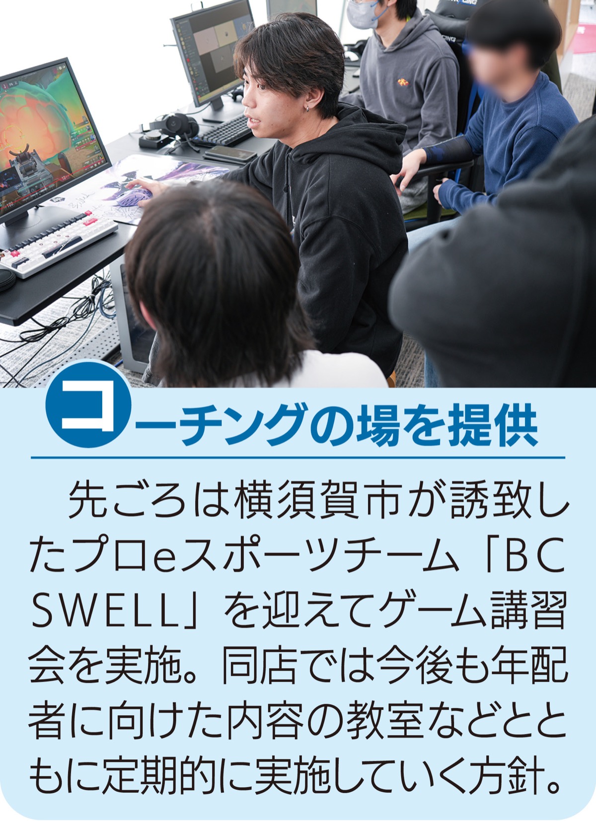 同店ではeスポーツ体験やスマートフォンに慣れ親しむための教室を開催しており、デジタル機器の操作などに苦手意識を持っている人のサポートに取り組んでいる。横須賀市がプロeスポーツチーム「BC SWELL」を呼び込んで活動を支援していることもあり、この分野の発展にも協力する。