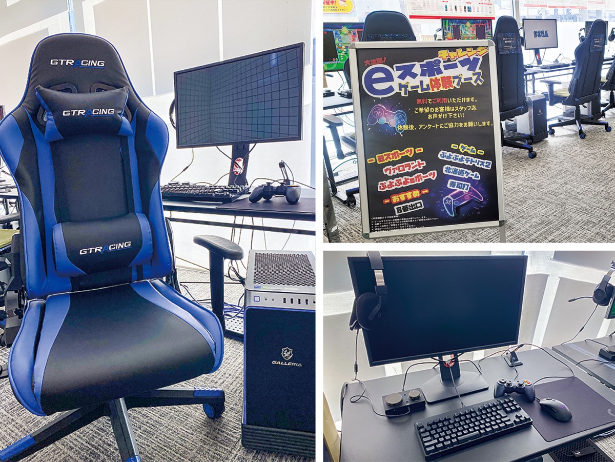 店内に最新機器を5台設置。世界大会種目の「VALORANT」や世代を問わず楽しめる「ぷよぷよeスポーツ」、タイピング力向上に役立つ「寿司打」などに挑戦できる。