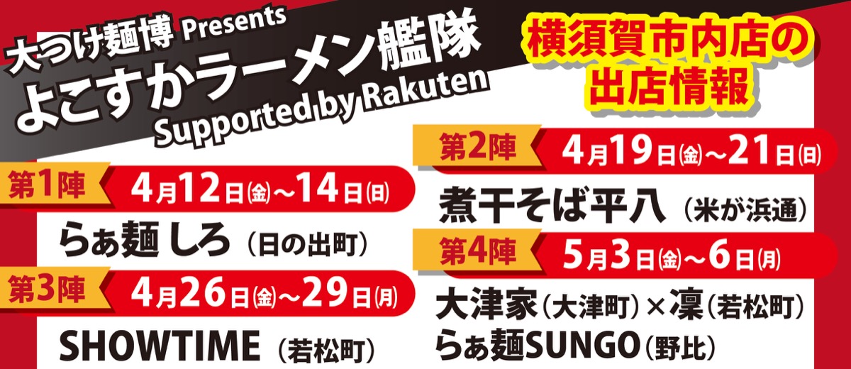 全国各地で人気のラーメン店が一堂に集まるフェス「大つけ麺博Presents よこすかラーメン艦隊 Supported by Rakuten」が4月12日(金)から5月6日(月)までの毎週末、三笠公園で開催される。主催は同実行委員会で、企画制作は全国でラーメンイベントを運営する(株)ブルースモービルと(株)オフィス黒船。期間中は各週8店ずつ、計32店舗が出店する。