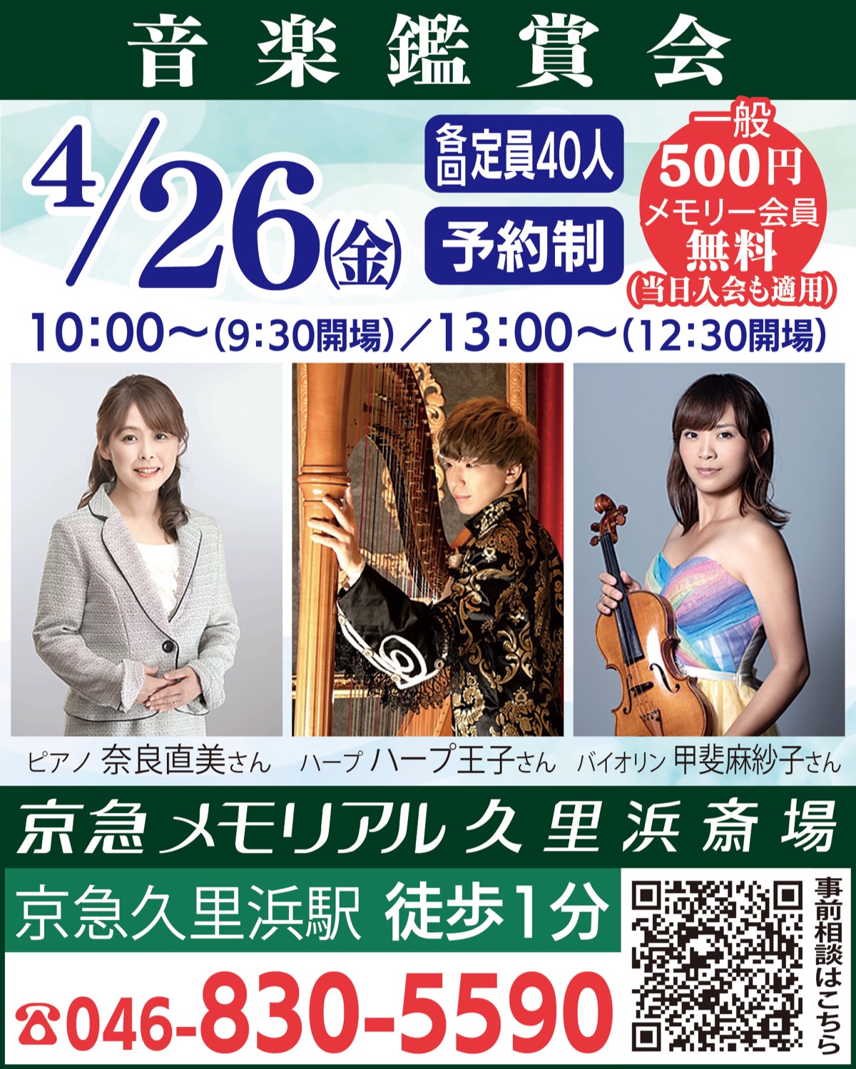 京急久里浜駅から徒歩1分、京急グループの葬祭業「京急メモリアル久里浜斎場」では、本格的な生演奏が楽しめる春のメモリアル音楽鑑賞会を4月26日(金)に開催する。