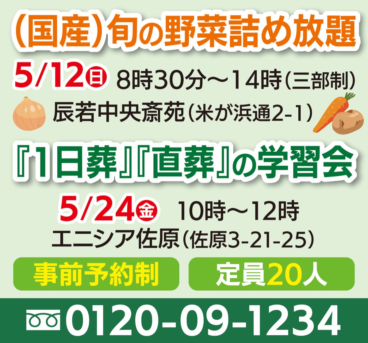 葬儀全般の疑問や質問に応じる個別相談会を5月12日(日)・18日(土)・24日(金)・30日(木)に実施する。費用無料。辰若中央斎苑、エニシア佐原、辰若本社、エニシア米が浜の4会場。午前10時から午後2時で予約制。申込は同社【フリーダイヤル】0120・09・1234