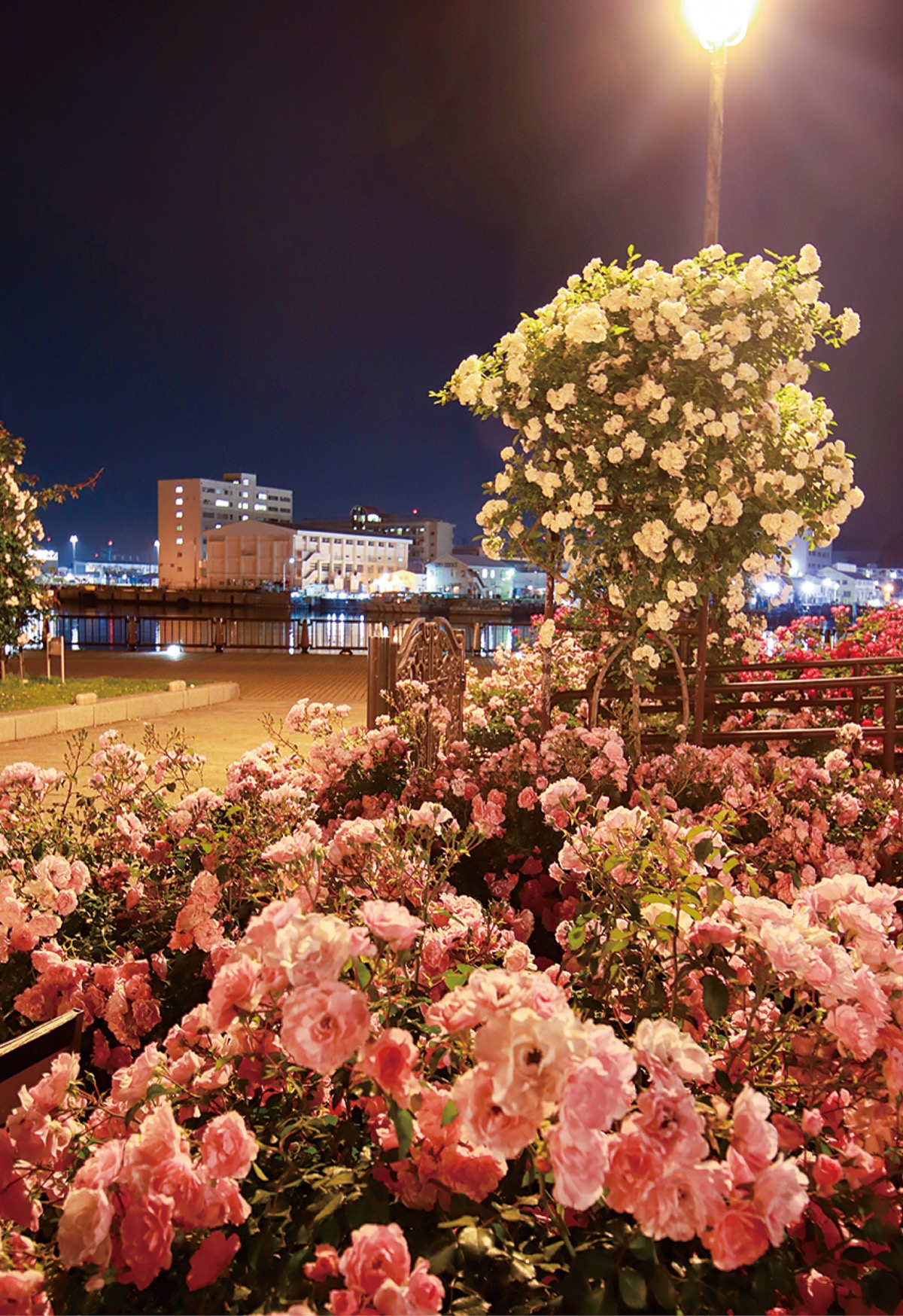 街灯の柔らかな光と海面ににじむ港の明かりに包まれた幻想的な空間で、"夜バラ"見物はいかが--。