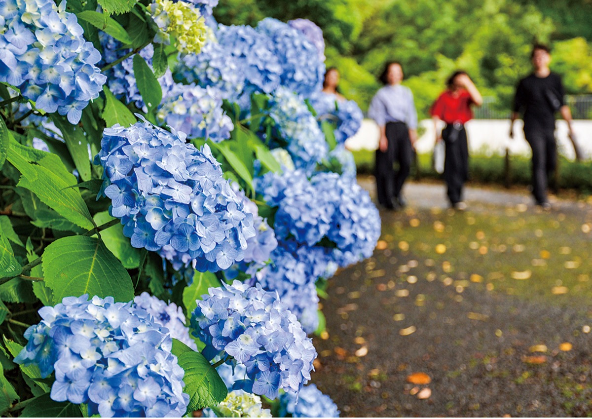 美術館を取り囲む約300mの園路沿いでは、同館の職員の手によって植えられた約300株のアジサイやガクアジサイが見事に咲き誇り、散策しながら愛でる人の姿が目立つ。