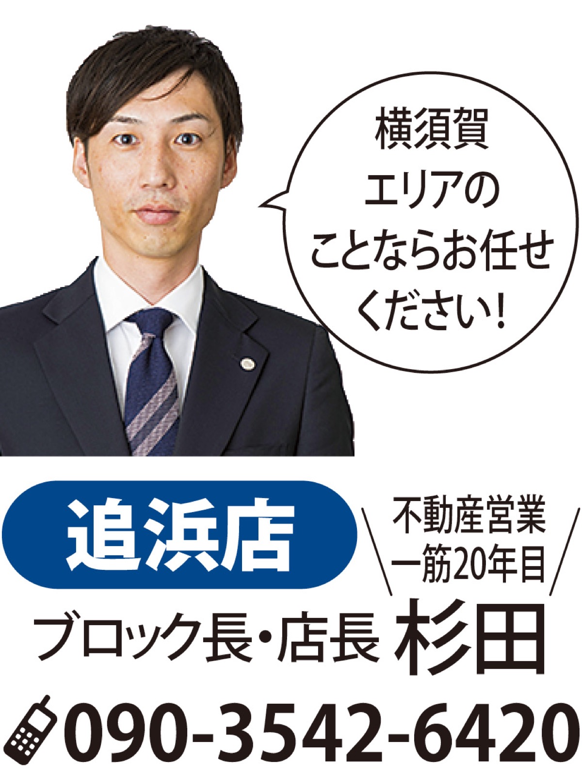 久里浜・横須賀中央・馬堀海岸・逗子の4店舗で店長経験がある杉田ブロック長は、不動産営業一筋20年。「三浦半島の物件のご売却はお任せ下さい」と話している。