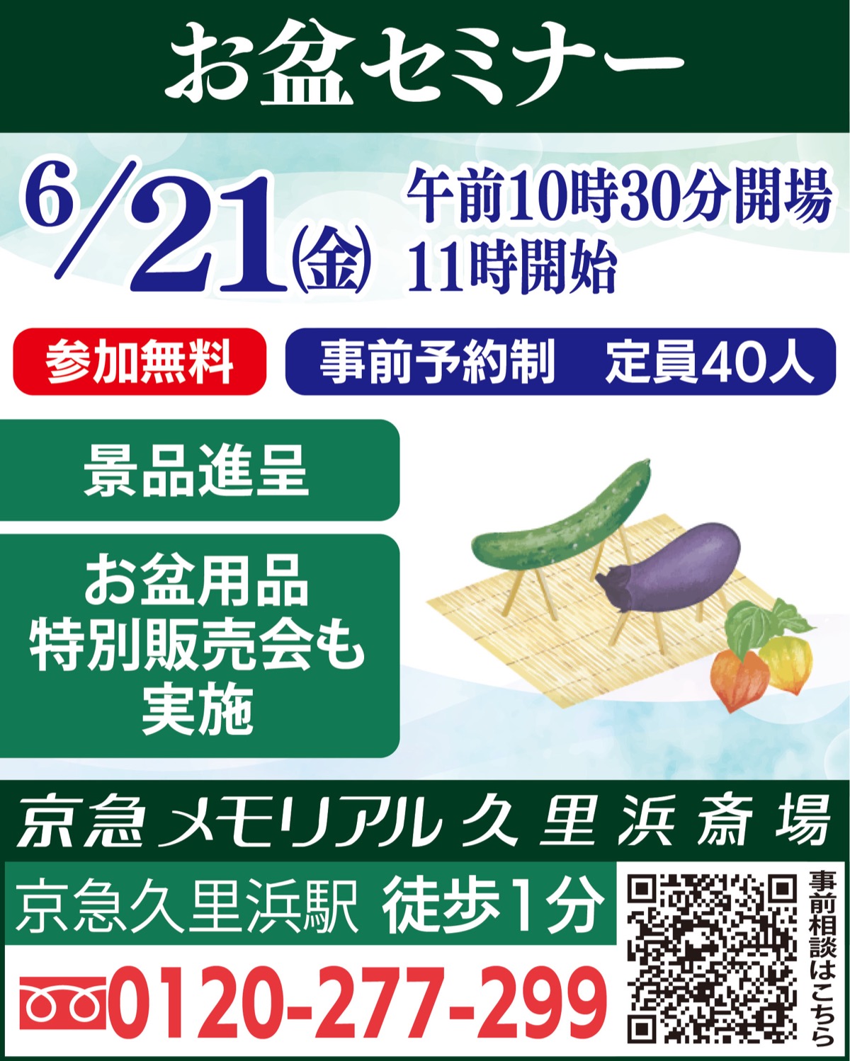 京急久里浜駅から徒歩1分の「京急メモリアル久里浜斎場」では、6月21日(金)に「お盆セミナー」を開催する。