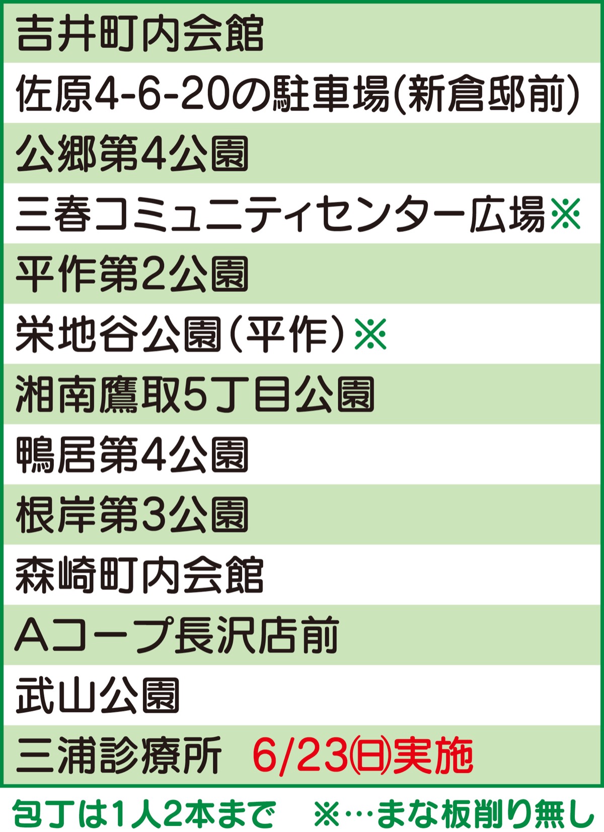 また、鈍った包丁と古いまな板を当日中に蘇らせるチャリティーイベントやヨーヨー釣り・模擬店など子どもが楽しめる催しも実施(一部会場除く)。午前10時から午後2時、会場は別記のとおり。荒天中止。(問)【電話】046・835・7720