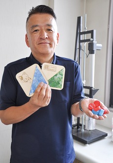 コースターにはロゴや似顔絵(写真も可)、メッセージなどの印字も可能。1点からの受注生産のため、個人の日常使いだけでなくSDGsや環境に力を入れる企業や団体のPRグッズ、記念品としても喜ばれそうだ。「海洋環境に意識を向けるきっかけにしてもらえれば」と本田社長。売上の一部は海洋プラごみ対策など環境保全活動に寄付する。
