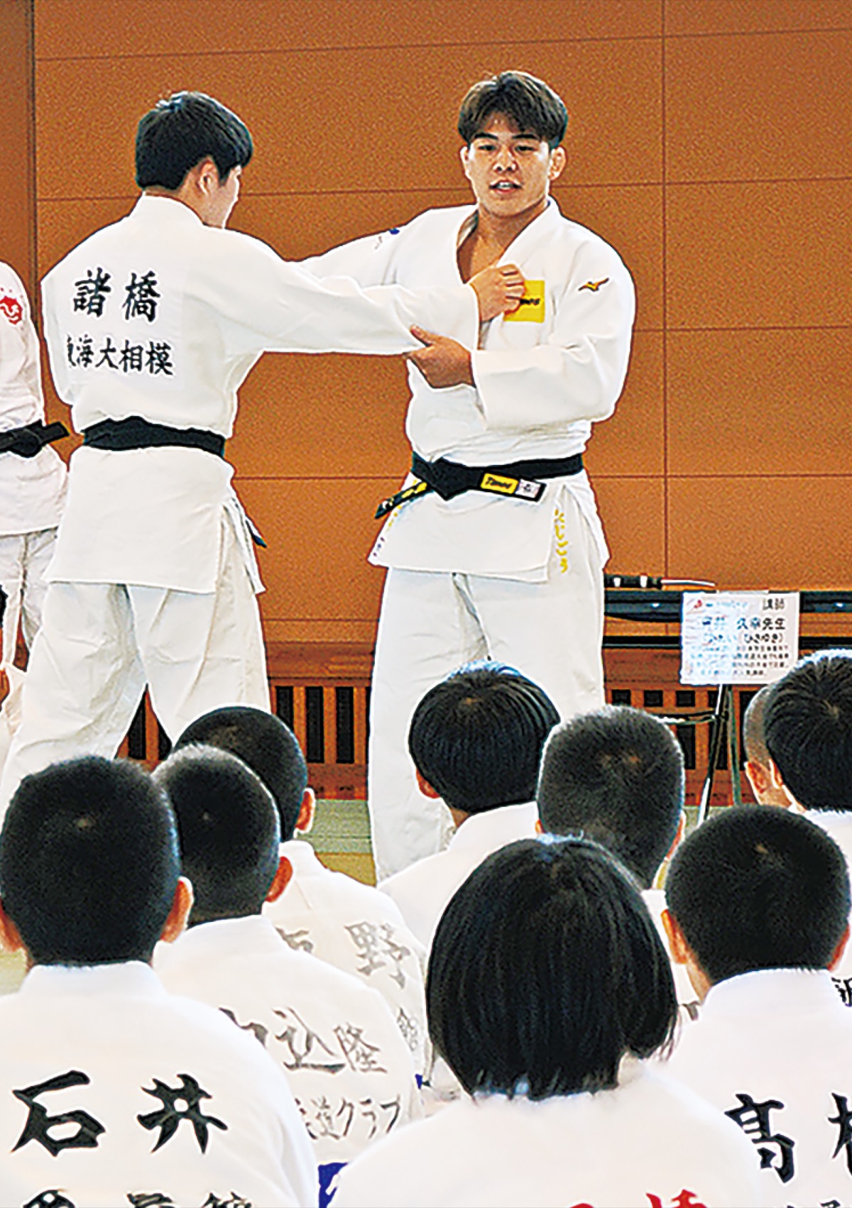 柔道に取り組む小学生に向けて、現役の柔道選手が実演指導を行う「キッズ柔道セミナー」が7月14日、横須賀市不入斗町の市総合体育館サブアリーナで開かれた。(一社)スポーツひのまるキッズ協会ら3団体の主催。低学年の部、高学年の部の2部制で行われ、児童約150人が参加した。