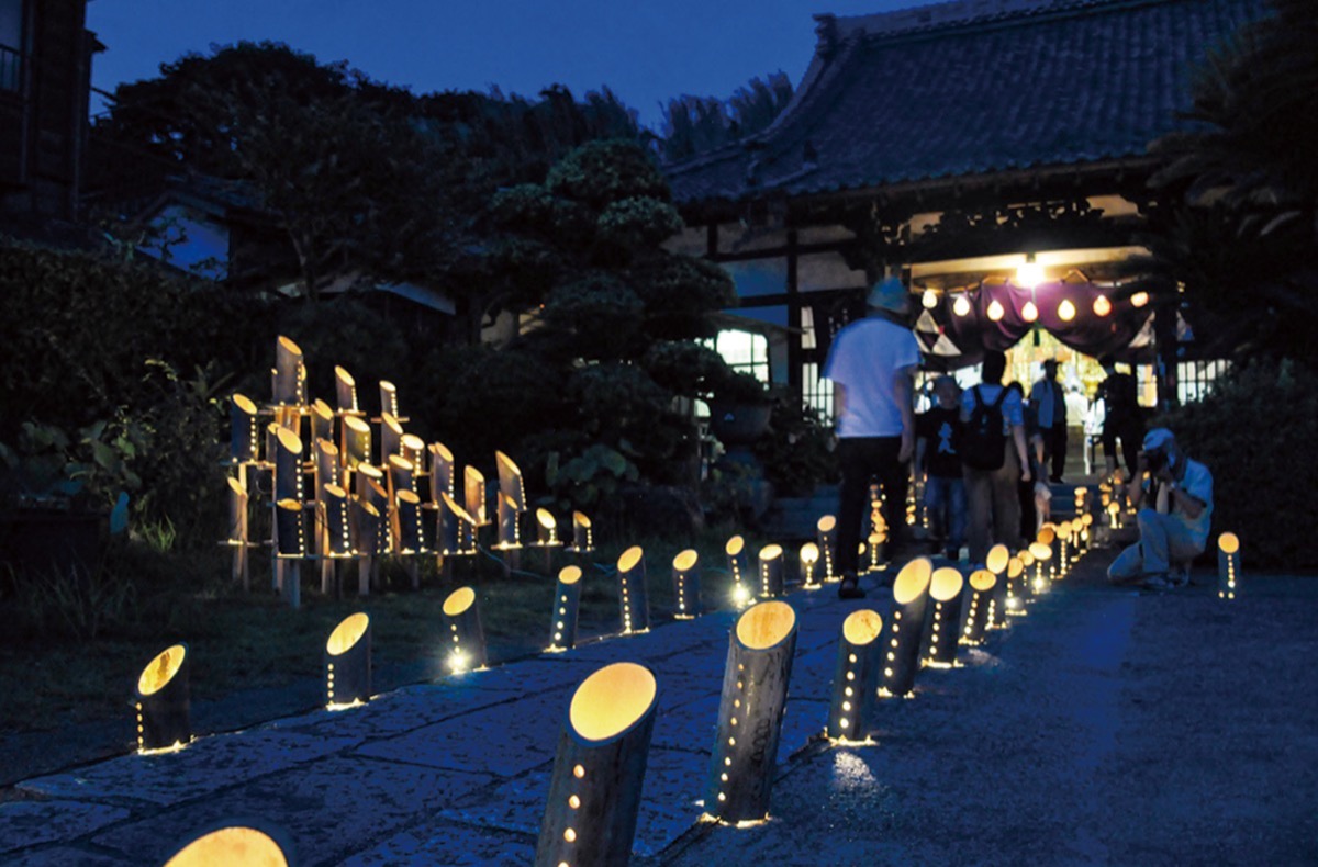 温かな明かりに照らされた境内で伝統的な盆と七夕を過ごす恒例の「三浦半島盆竹灯籠まつり」が6つの寺でリレー開催されている。盆竹灯籠まつり実行委員会(MONKS三浦半島)の主催。