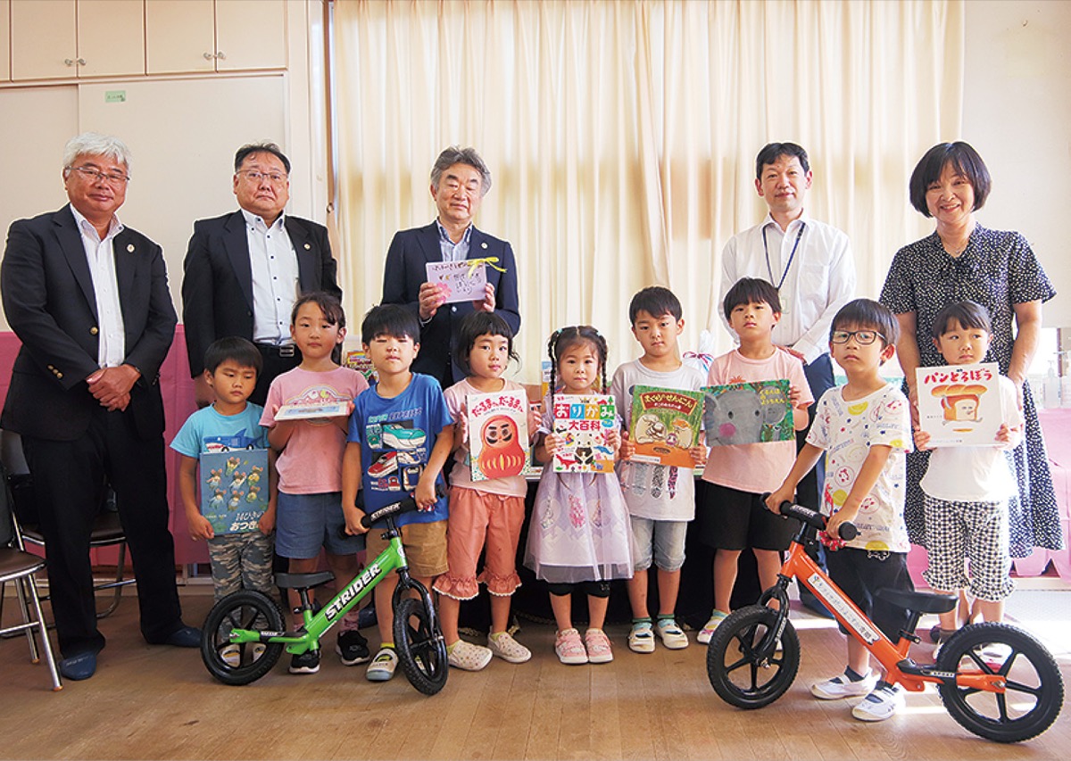 一般財団法人シティサポートよこすかは7月22日、絵本やおもちゃ、キックバイク、ヘルメットなど合計約40点を武山保育園に寄贈した。