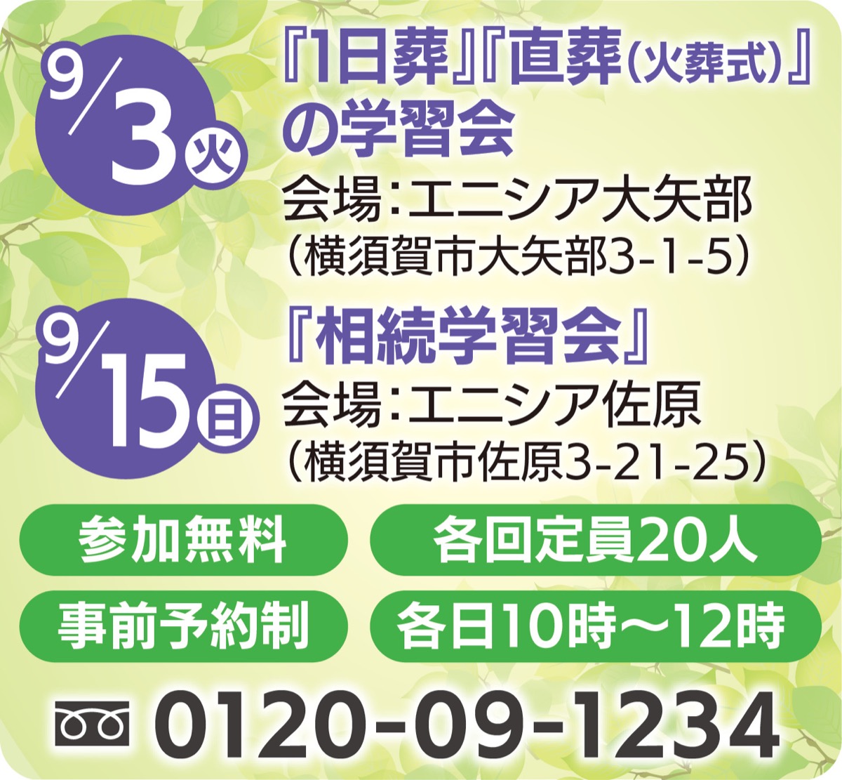 しかし「種類が多くてどの葬儀が合っているか分からない」と迷う人も少なくない。同社では9月3日(火)に1日葬と直葬(火葬式)に関する学習会を実施し、それぞれの葬儀の違いやメリット・デメリットなどを詳しく解説する。ほかにもマナーや葬儀前の準備、費用についても説明する。