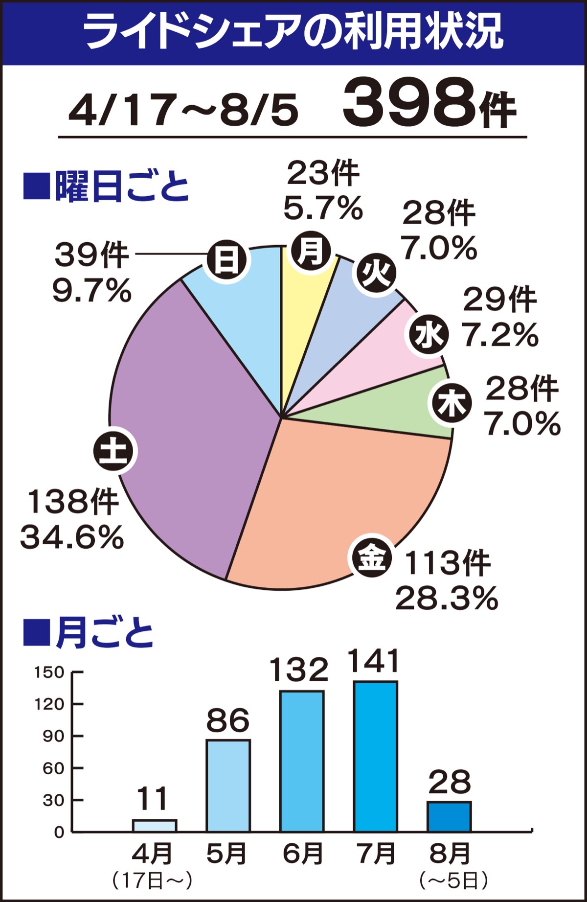 県によると、4月17日〜5月9日の1日平均利用は0・9件だったが、月を追って増え、6月19日〜7月16日の期間には5件となり、想定に達した。県はアプリの改良や周知活動が利用増を底上げしているとみており、「需要があることは分かった。秋の観光シーズンにさらに利用が伸びれば」と一層の需要増に期待をにじませる。事故やトラブルはこれまで発生していないという。