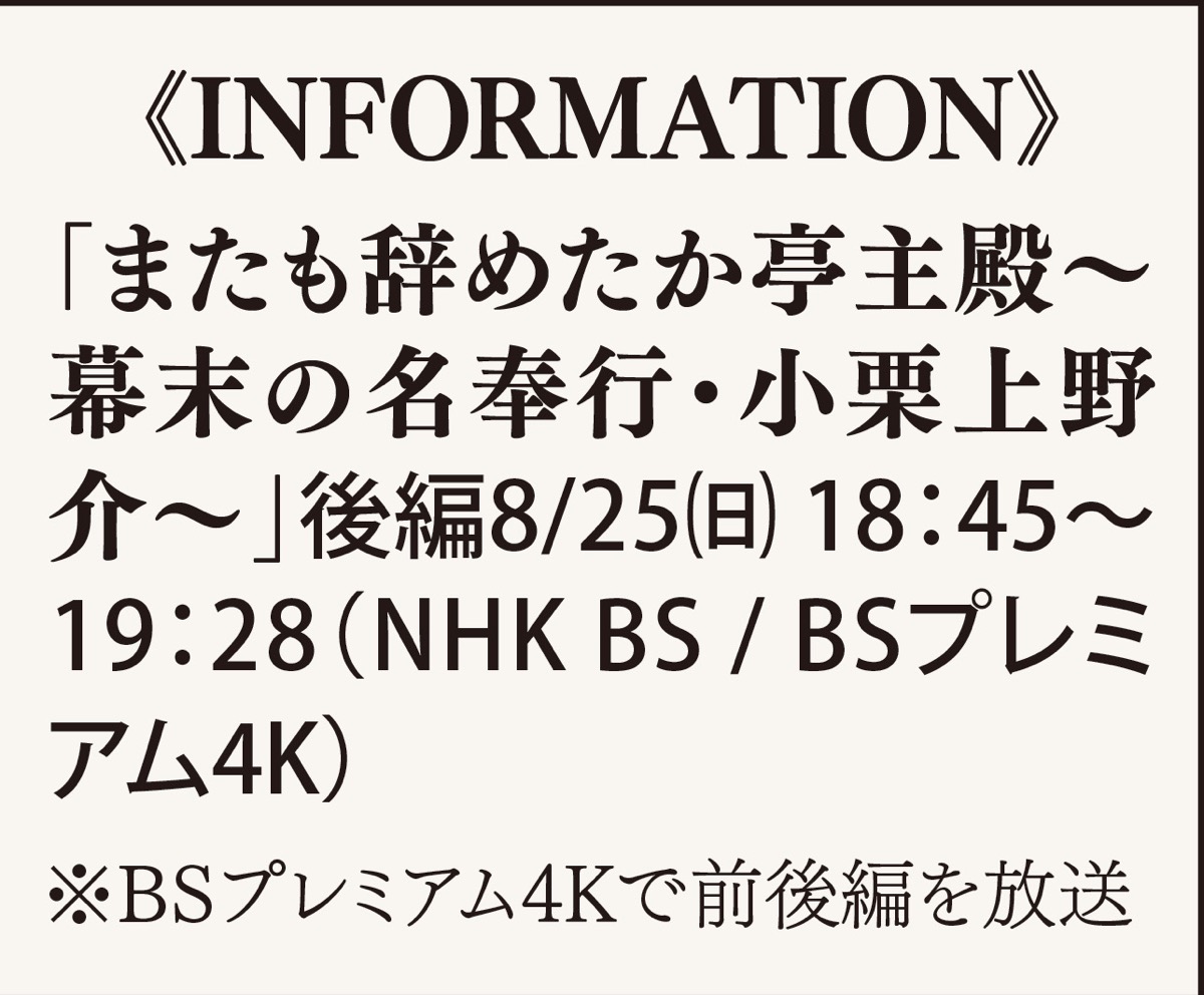 ドラマ「またも辞めたか亭主殿〜幕末の名奉行・小栗上野介(こうずけのすけ)」は、2003年のNHK正月時代劇として放送された。