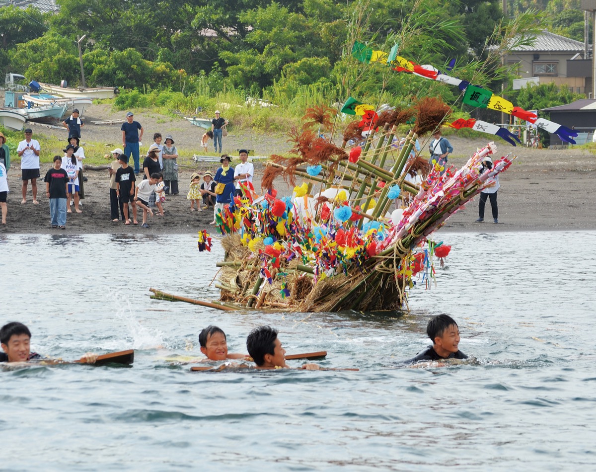 三浦市初声町三戸に伝わる盆の伝統行事「三戸のオショロ流し」が8月18日、三戸海岸であった。「セイトッコ」と呼ばれる子どもらが麦わらと竹で編まれた「オショロ船」を沖まで引き、先祖の霊を送った。