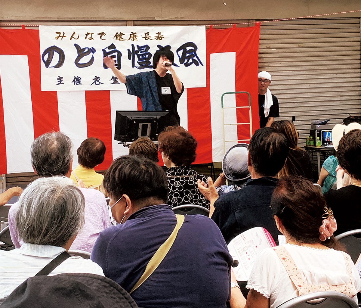 同商店街では「みんなで健康・長寿」を合言葉に毎日午後3時に商店主や買い物客が一斉にラジオ体操に取り組むなど、健康増進を兼ねた賑わい創出に力を入れている。のど自慢大会も参加者が人前で歌声を披露し、日頃の活力にしてもらうことを念頭に企画した。