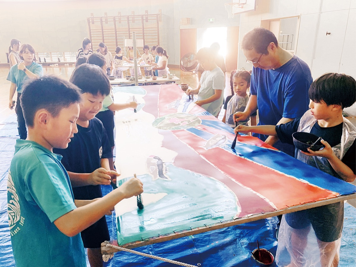 三崎小学校の児童らがこのほど、10月に開かれるイベントで活用するため、オリジナルの大漁旗12枚を制作した。