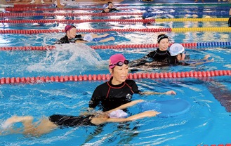 肢体不自由者や視覚障害者、知的障害者、水泳愛好者など約150人が参加。平泳ぎや背泳ぎ、自由形などの記録を測定した。それぞれが持つ障害の度合いによって、ビート板を使用したり、介助者のサポートを受けながら完泳する場面もあった。