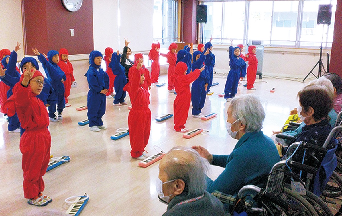 同活動は横須賀中央ライオンズクラブ(山口智弘会長)による地域奉仕貢献事業の一環。地域の子どもたちと高齢者をつなげ、高齢者福祉と園児の健全育成に寄与する目的で40年以上行われている。日本水産観光(株)による送迎バス協力のもと、園児が訪問。手話を使った創作ダンスや、「きらきら星」「ジングルベル」の鍵盤ハーモニカ演奏、合唱などを披露した。会場に集まった入居者は園児の元気いっぱいの発表に合わせ、手を叩くなどして楽しんだ。