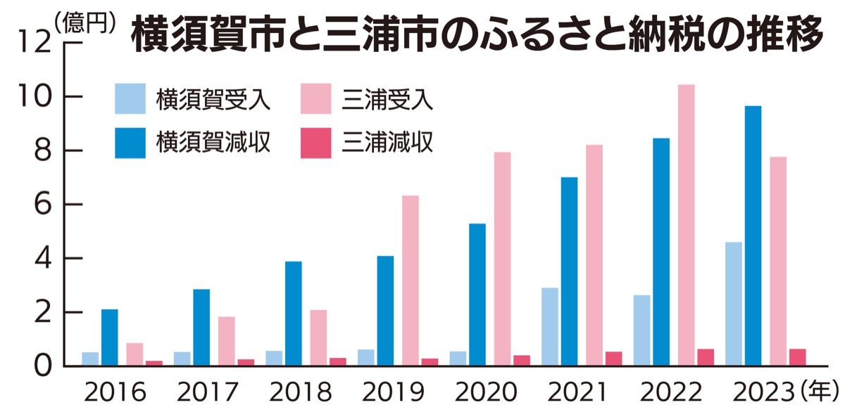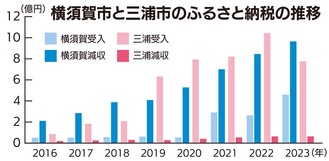三浦市は23年度約6千万円の流出に対し、約7億7千万円の寄付があった。制度導入以来、”黒字”を維持しており、制度による恩恵を受けている立場だ。