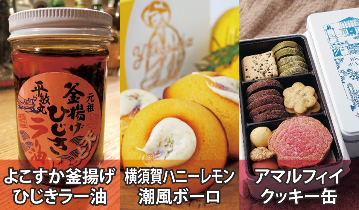 商品のラインアップは、浦賀のハチミツを使用した「横須賀ハニーレモン 潮風ボーロ」(有限会社マーロウ)や横須賀産の釜揚げひじきを使用した食べるラー油「よこすか釜揚げひじきラー油」(中華居酒屋じぇっと天)、地元食材を使ったクッキー「アマルフィイクッキー缶」(株式会社ビィバリュー)など。
