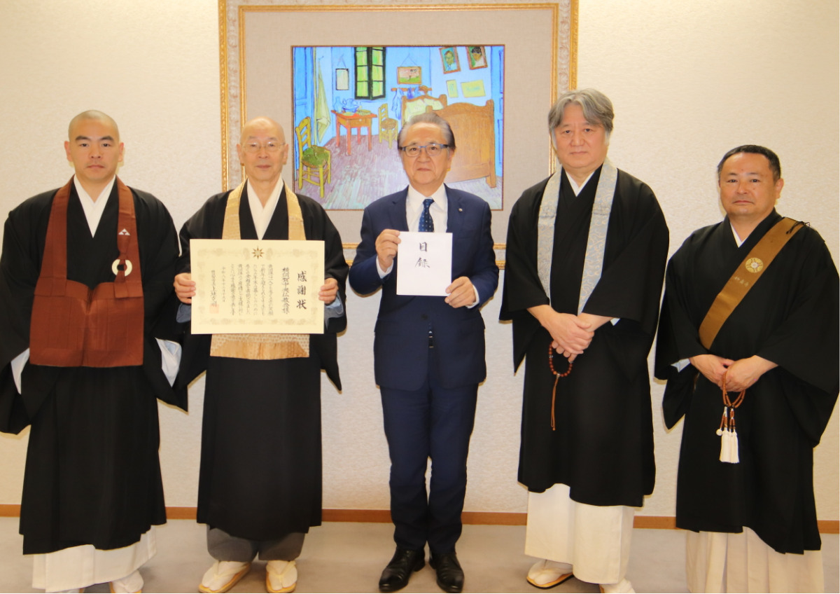 主に横須賀中央周辺の宗派を超えた18の寺院で構成される「横須賀中央仏教会」(竹林貞一会長/貞昌寺)は12月19日、横須賀市地域福祉課へ15万円を寄付した。虐待などで一時保護されている市内約100人の子どもたちへの食糧支援代に充当される。これを受けて上地克明市長はこの日、感謝状を贈呈した。