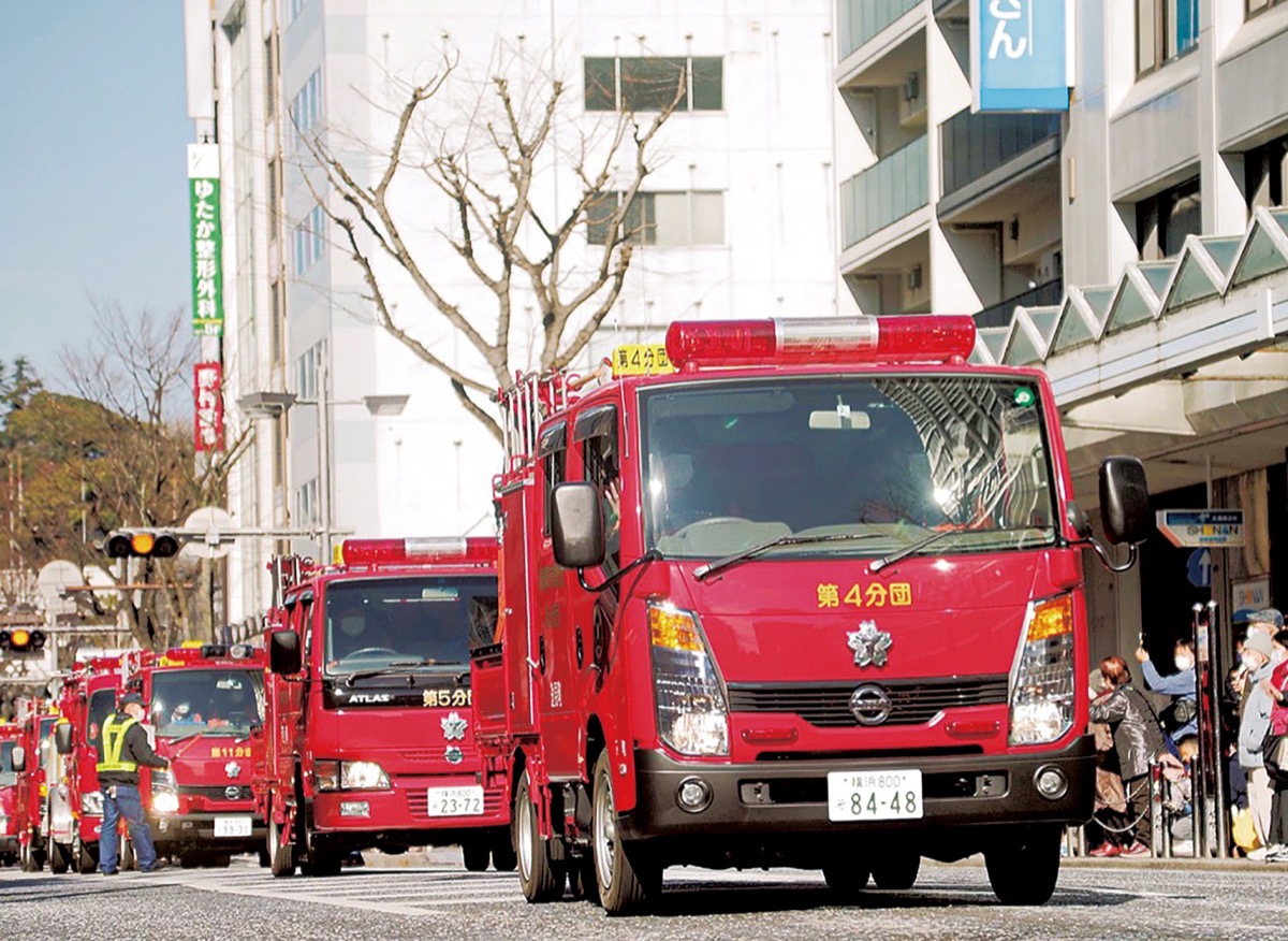 新年の防火と防災を祈願して消防車両が一斉に行進する「消防出初式(YOKOSUKA消防パレード2025)」=写真=が1月12日(日)、横須賀中央大通りで行われる。午前10時30分から11時10分。雨天中止。