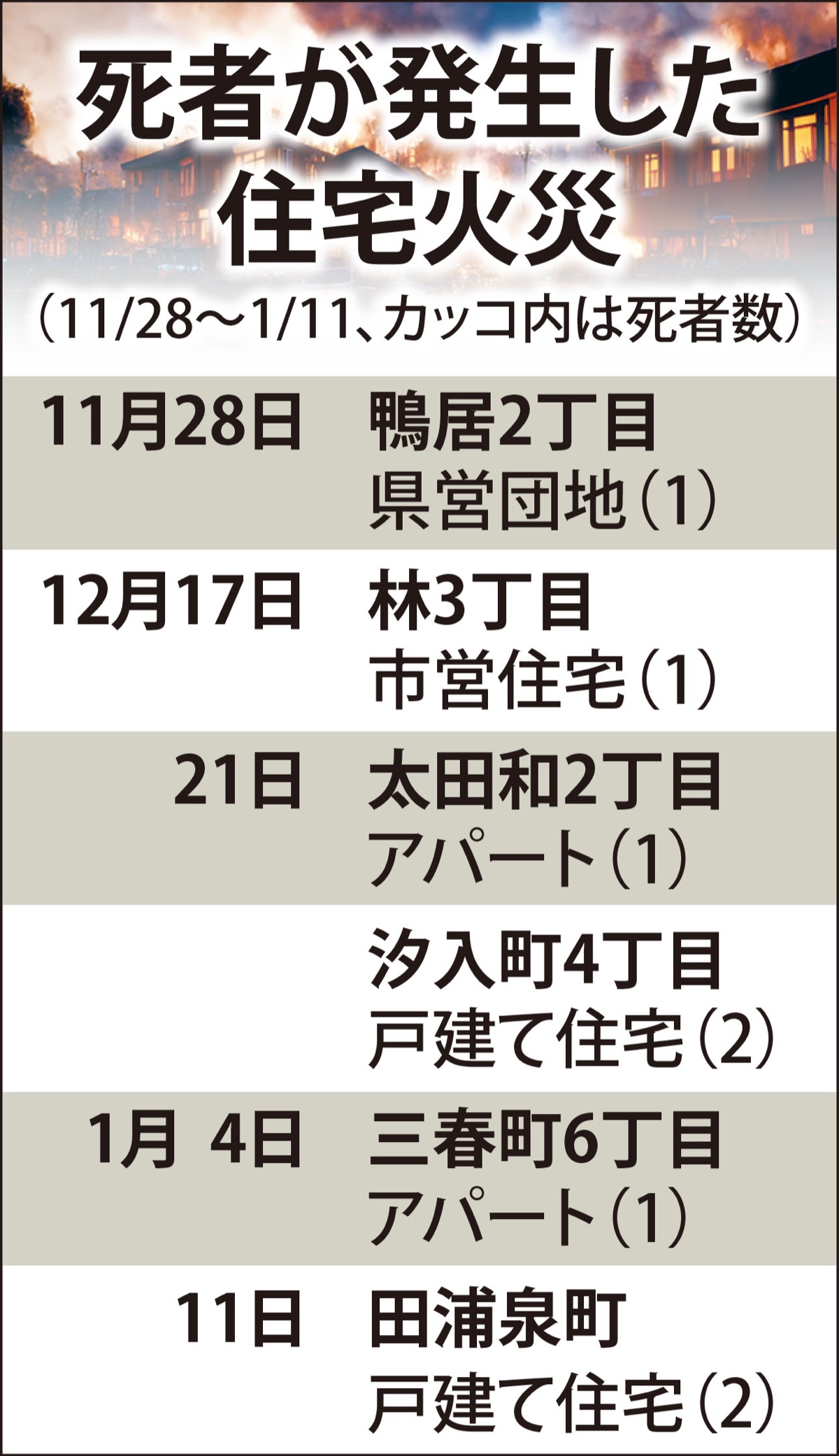 市消防局によると、同期間中に死者が発生した住宅火災は6件。昨年11月28日に鴨居2丁目の県営団地、12月17日に林3丁目の市営住宅、同21日に太田和2丁目のアパートと汐入町4丁目の戸建て住宅でそれぞれ火災があり、焼け跡から遺体が見つかった。1月4日には三春町6丁目でアパート火災があり、住人が搬送先の病院で死亡、同11日には田浦泉町の住宅火災で焼け跡から2人の遺体が見つかった。