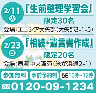 葬儀全般の疑問や質問に応じる個別相談会を2月5日(水)・11日(火)・17日(月)・23日(日)・28日(金)に実施する。費用無料。辰若中央斎苑、エニシア佐原、辰若本社、エニシア米が浜、エニシア大矢部の5会場。午前10時から午後2時で予約制。申込は同社0120・09・1234