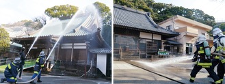 24日には大椿寺でも同様の訓練が実施された。本堂から出火した想定で通報、初期消火を訓練。消防隊の到着後は放水を行った。隣接する椿の御所幼稚園の園児らも避難訓練を実施した。