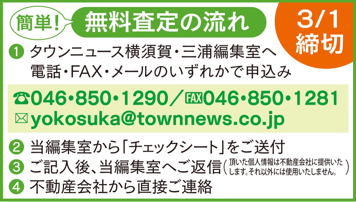無料査定の希望者は、タウンニュース横須賀・三浦編集室【電話】046・850・1290【FAX】0466・850・1281もしくは【メール】yokosuka@townnews.co.jpのいずれかで申し込む。応募締切は3月1日(土)。当編集室から送付する「チェックシート」を記入した後、それを返信するだけなので、関心のある人は気軽に問い合わせを。