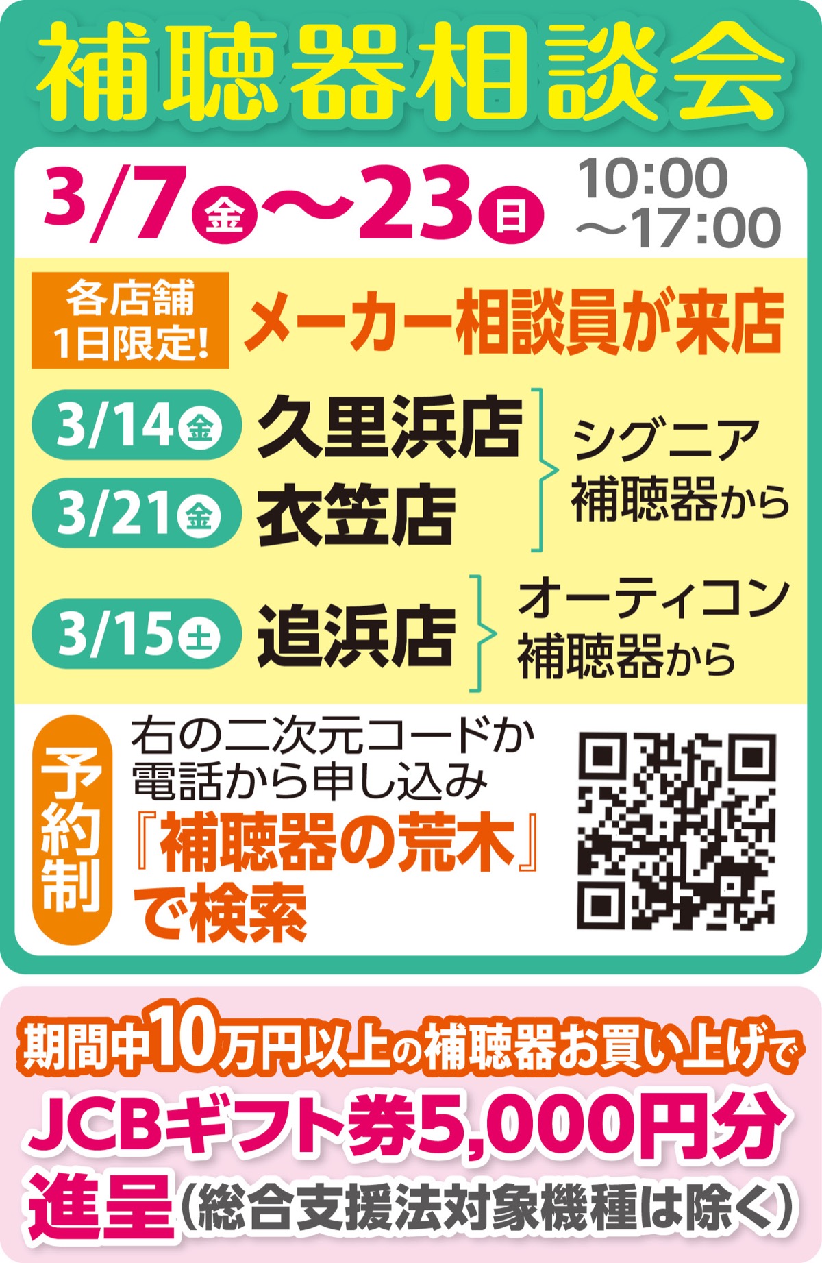 毎度好評の「補聴器相談会」は3月7日(金)から23日(日)まで毎日開催中。「購入を考えている」「買い換えたい」「不具合が気になる」という悩みやニーズに対応する。