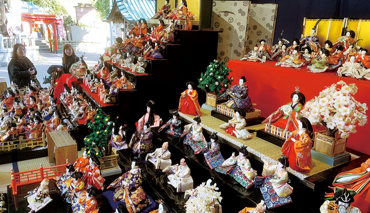 三浦市三崎の海南神社境内でひな人形約350体が飾り付けられ、参拝客の目を楽しませている。本殿や神楽殿、階段などそこかしこで、色鮮やかな人形が春のひとときを演出している。展示は3月9日(日)まで。