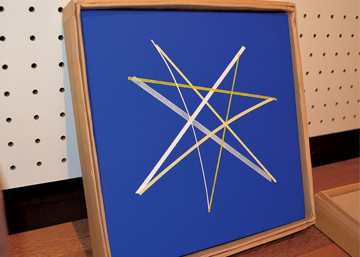 一見してマスキングテープで星を模ったように見える作品も、アクリル絵の具を厚く塗った「絵画」。作品を作る過程で捨てられるマスキングテープをあえて丁寧に描くことで、テープそのものに意味を見出す。