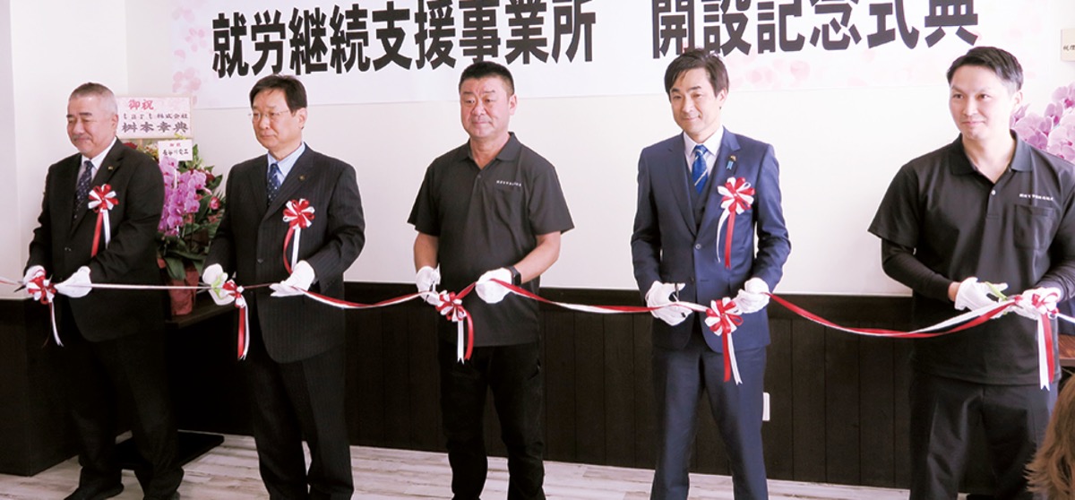 民間救急サービスや障害者グループホームを運営するあゆみグループは、障害者の就労継続支援事業として、A型の「あゆみワークス」とB型の「あゆみダイニング」の拠点施設を三浦市南下浦町上宮田に同時開設した。4月15日には、同社の飯島徳貴社長=写真中央=や吉田英男三浦市長らが開所を祝うテープカットを行った。
