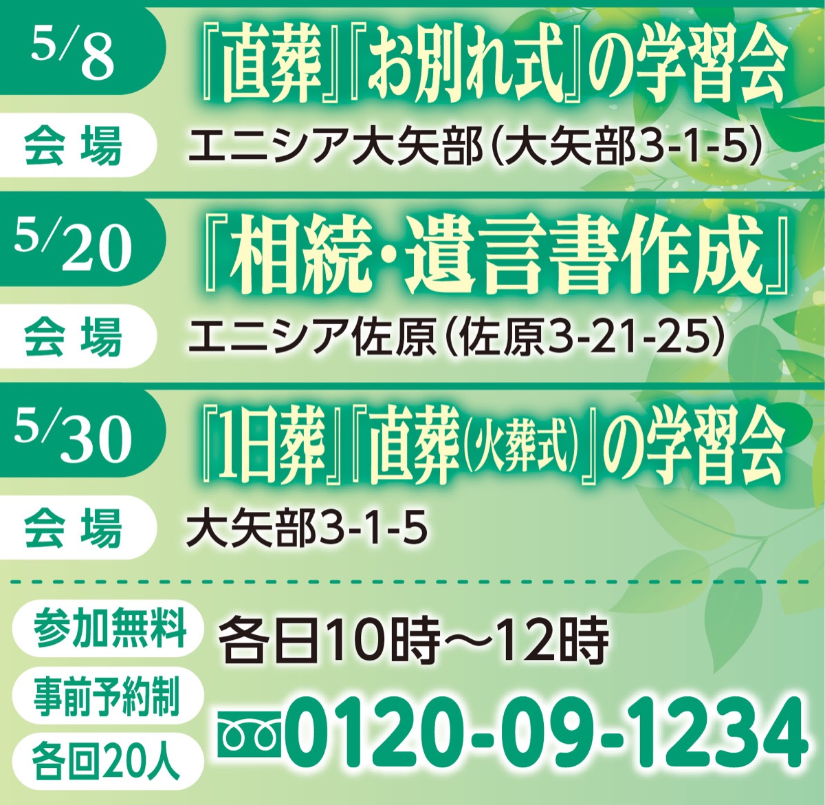 核家族化や少子高齢化などで葬儀の多様化が進む昨今。地域密着の辰若葬儀社では、5月8日(木)に直葬とお別れ式の知識を深める無料の学習会を開く。