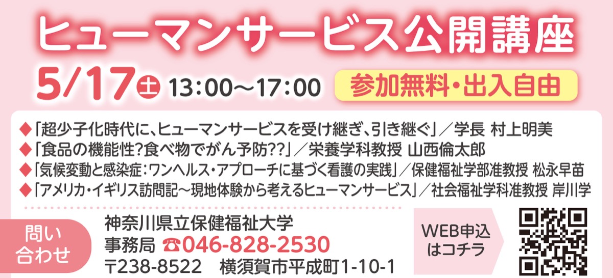神奈川県立保健福祉大学では「ひと」としての尊厳を大切にする考え方を広く共有する「ヒューマンサービス公開講座(春期)」を5月17日(土)に実施する。参加無料。
