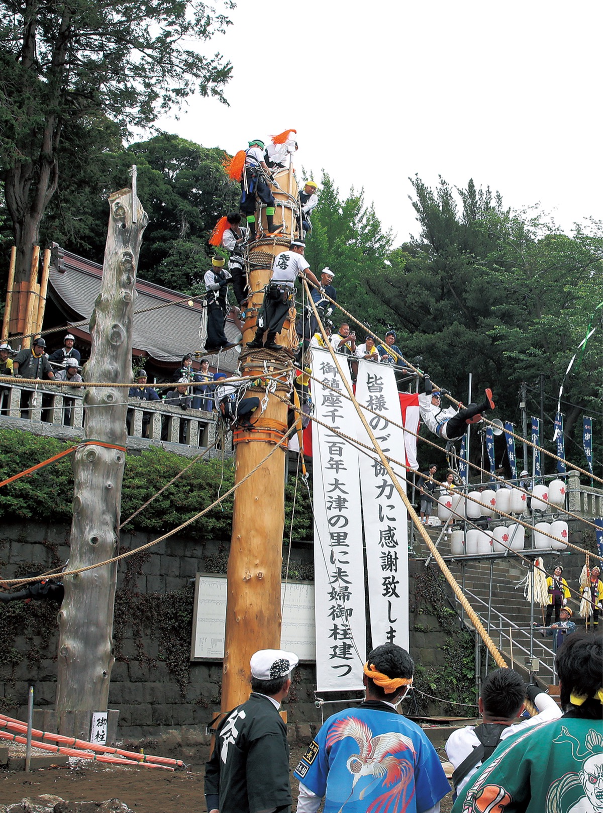 横須賀市大津町に鎮座する大津諏訪神社で5月17日・18日の両日、創建1200年の奉祝行事「御柱祭」が執り行われた。初日はあいにくの雨に見舞われたが、長さ12m、重さ約6・5トンのもみの巨木を威勢のいい掛け声と鳴り物とともに神社に運び込む「里曳き」、2日目は神前に奉納する「建御柱」を挙行した。長野県の諏訪大社の氏子ら約200人も応援に駆け付けた。2日間で同神社の氏子や見物客のべ1万人が集まり、節目を祝った。