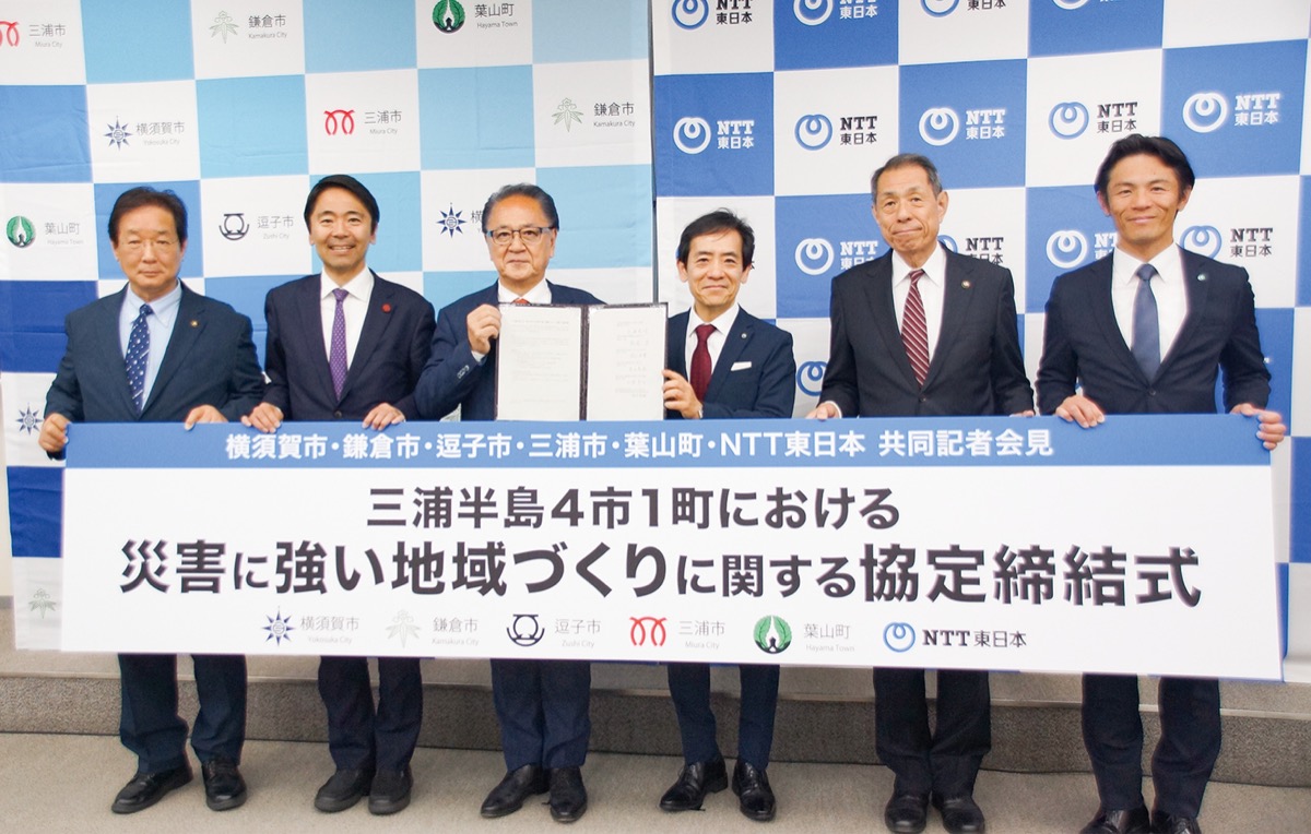 三浦半島4市1町(横須賀市・三浦市・逗子市・葉山町・鎌倉市)は5月21日、半島地域特有の災害リスクに対応し、エリア一帯で災害に強い地域づくりを推進することを目的とした防災連携協定をNTT東日本と締結した。NTT東日本本社が広域の自治体と防災協定を結ぶのは初めてのこと。
