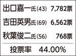 任期満了に伴う三浦市長選は6月15日に投開票が行われ、それぞれ無所属で新人の出口嘉一氏(43)が、現職の吉田英男氏(69)と新人の秋葉俊二氏(56)を退けて初当選を果たした。前回は無投票で8年ぶりとなった市長選の投票率は44・00%。2017年の38・90%を5・1ポイント上回った。