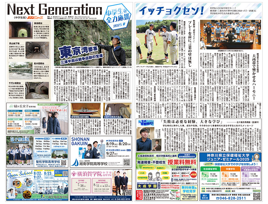 横須賀・三浦市内の公立・私立中学校に配布される「Next Generation(中学生新聞)」。2025年夏号では、三浦半島に眠る戦跡をピックアップ!戦後80年ということもあり、さらに注目を浴びる戦跡。野比中学校や長井中学校にある戦時中の遺品や戦艦の模型などにも迫ります!