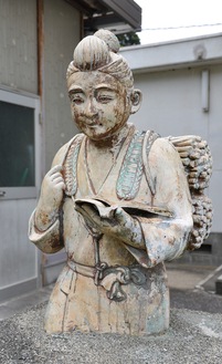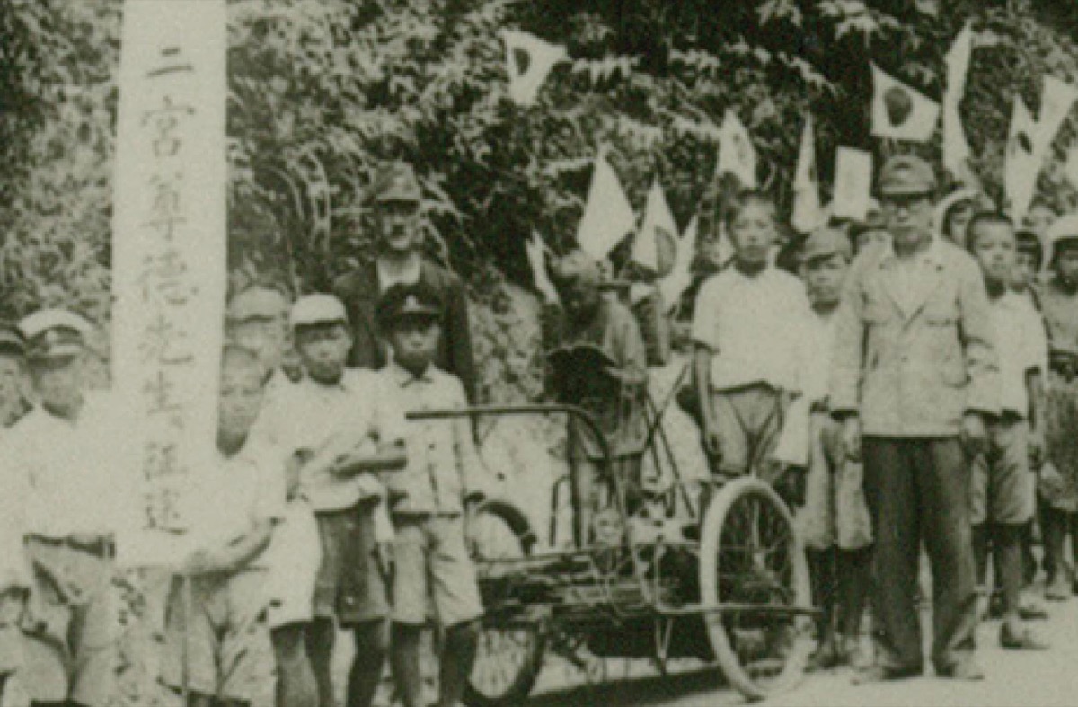 創立151年の歴史を持ち、2025年3月に閉校した横須賀市の旧走水小学校の校庭の一角には、現在も金次郎像が残されている。台座には「昭和十二年十月十五日達之 寄附者横濱 細川平蔵」と刻まれているが、42年9月ごろの記録写真に日の丸の旗を掲げた金次郎の銅像が校長の引くリアカーで運び出される姿があり=右下写真、その後に再建されたものであることがわかる。年代は不明だが、陶製のため戦時中と推察される。三浦半島の戦争遺跡に詳しい東京湾要塞研究家のデビット佐藤さんによれば「逸見小、豊島小にある金次郎像は石造で走水小と同じく置き換えられた。逸見小には像が2体あり、ひとつは彩色が施され木箱の中に保管されている」と話す。