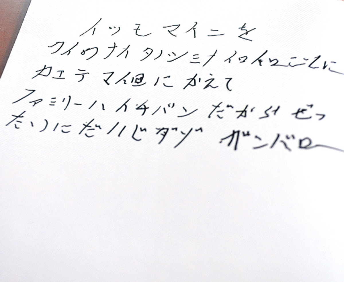 「ファミリーハイチバンだからゼッたいにだいじダゾ」(原文ママ)――。4年前に亡くなった父・経雄(つねお)さん(享年67)が遺した手紙を、大島店長は大事に保管している=写真下。表現がカタカナ混じりなのは、経雄さんの妻で同店長の母・リタさん(62)がフィリピン出身のため。息子は「直筆の文が持つ不思議な力を感じた。無限大の可能性を伝えたい」と使命感に駆られた。文字や内容に人それぞれの個性が生まれる手紙。自身の店で客に書く機会を提供し、その”良さ”を再認識してもらうことが狙いだ。大島店長は「さびれても、きっと残る文化なはず。皆さんも、思いを手紙にしてほしい」と話している。