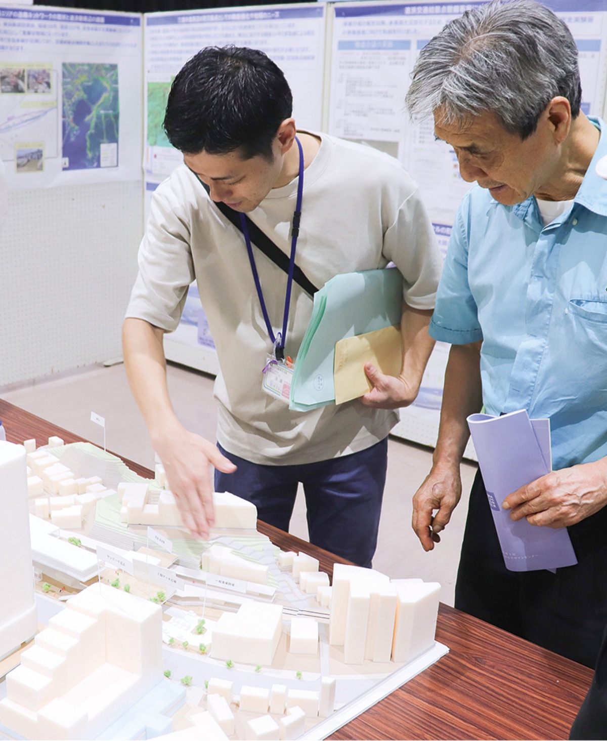 1部と2部の間には、会場に設置された事業計画パネルや追浜地区を模型にした展示などが行われ、参加者らは疑問や質問を担当者らにぶつけていた。開発の経過とまちの変容に関心があり、参加したという湘南鷹取在住の蒲谷茂さん(80)は、鷹取方面から16号線に出る雷神社前の踏切の信号の間隔に言及。特に通勤時は交通渋滞が起こりやすく、「まちを見つめなおすこの機会に検討してくれたら。また、今後駅西側にもより一層目を向けてくれたら」と希望を話した。