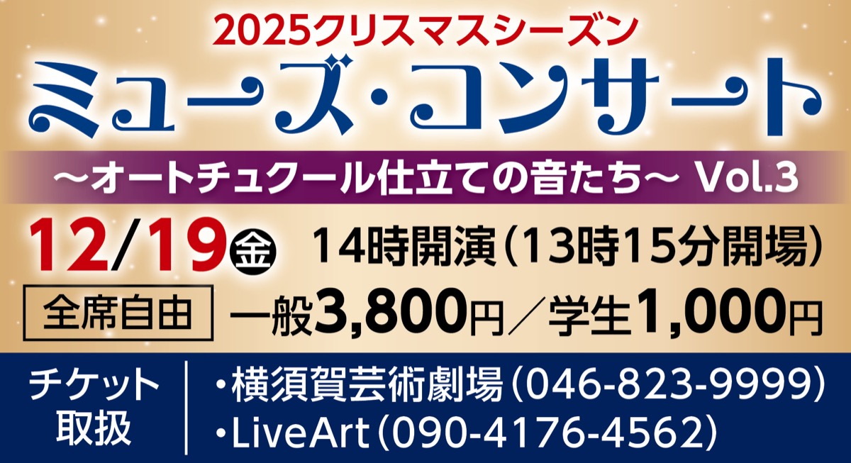 横須賀芸術劇場小劇場(横須賀市本町3の27)で12月19日(金)、「ミューズ・コンサート〜オートクチュール仕立ての音たち〜」と題したコンサートが開かれる。音楽と衣装の融合を目指すコンサートの第3弾で、クラシックの名曲から定番のクリスマスソング、昭和歌謡など多ジャンルの音楽が披露される。Live Art(リブアート)(鎌倉市)の主催。