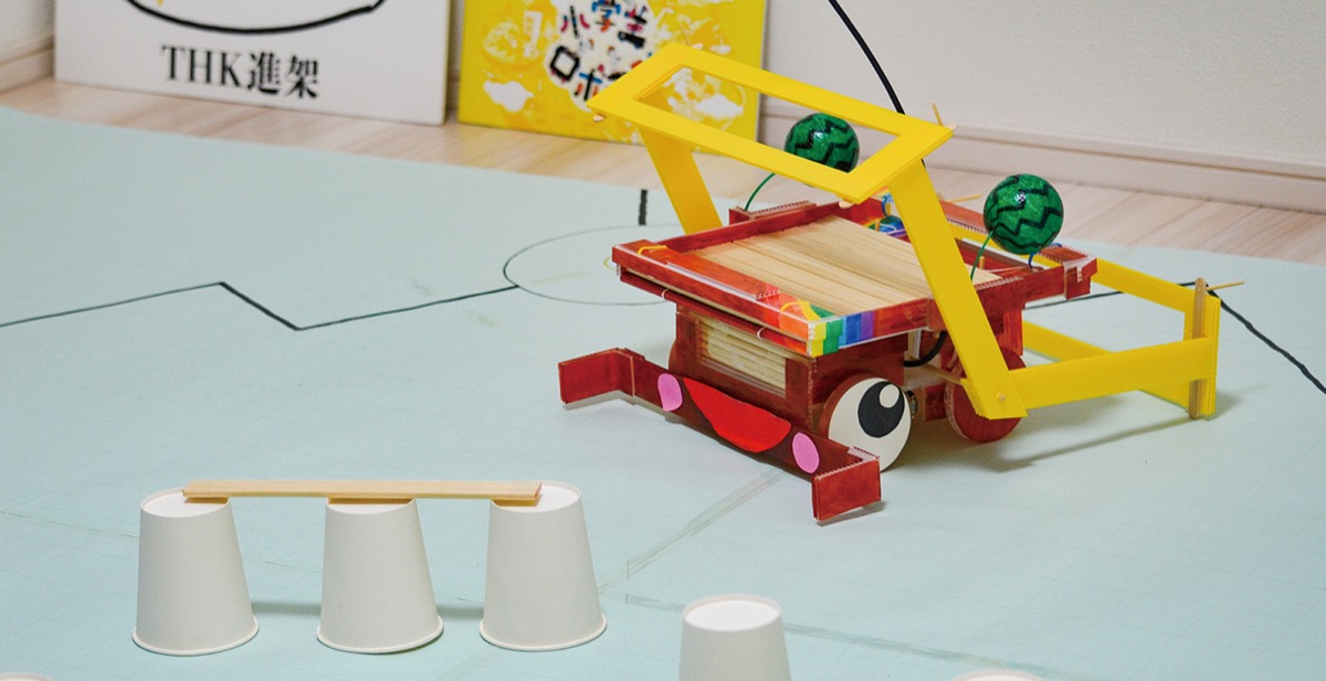 主な材料はプラスチック段ボールで、細かいパーツにはアイスの棒や竹ひごを使用。審査対象となるデザインはクワガタをイメージし、走行すると車輪部分の目玉がくるくると回るコミカルな外見とした。機能性も高めるために、試作品を何度も製作。制限時間内に多くの紙コップを一気に運ぶためにアームを取り付けるなど、試行錯誤を繰り返した。
