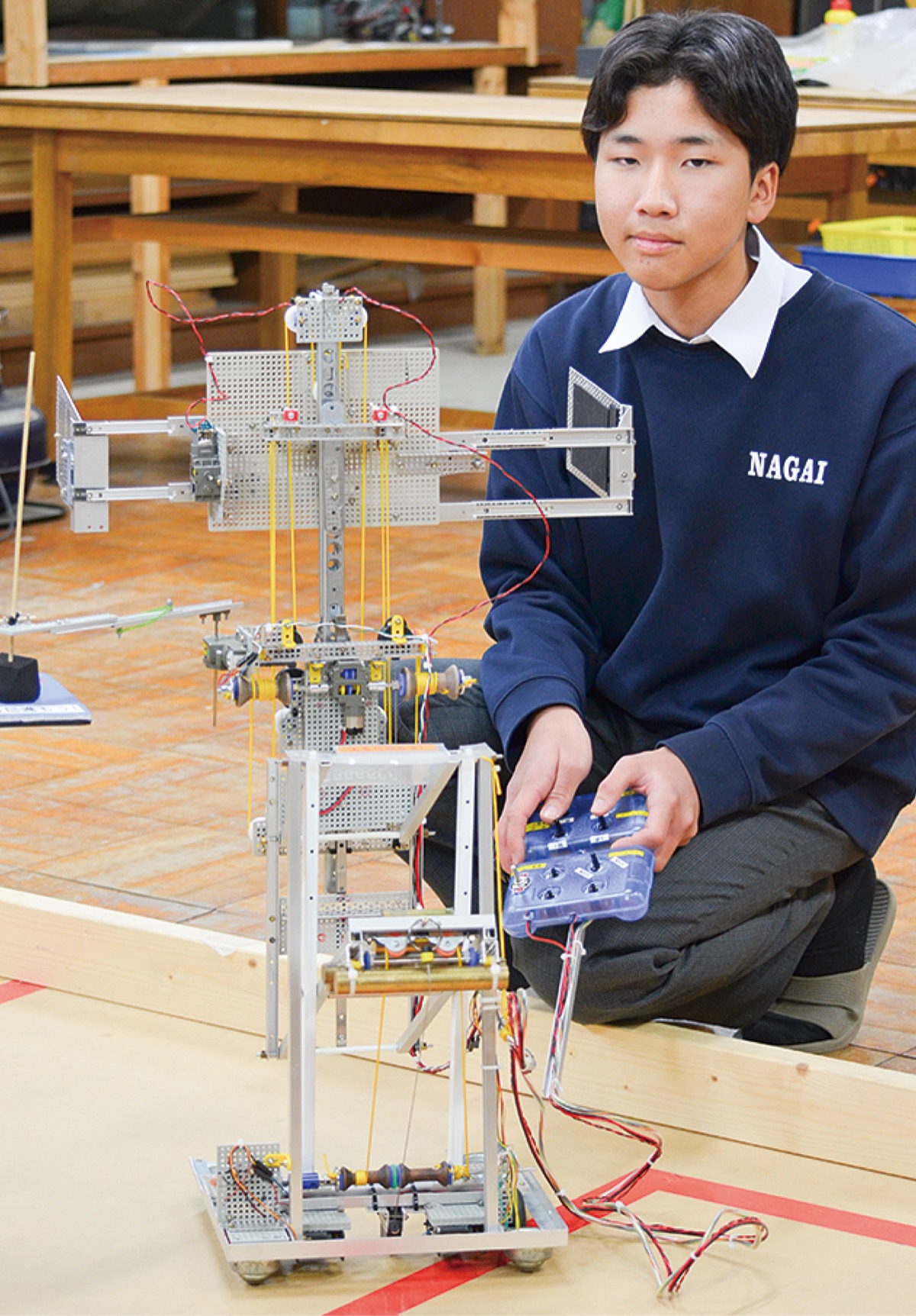 独自に製作したロボットを操作し、制限時間内に積み上げた段ボール箱の高さを競う競技。全国優勝を目指し、前年度の3年生が手掛けたロボットに何度も改良を加えながら、部室に設置した本番同様のコートで練習を重ねてきた。